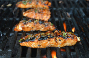 7. Place marinated salmon on hot grill or pan. Let cook – without touching it! – for 5-7 minutes until lightened in color. Flip fish over with thin spatula. (If you’ve oiled your grill, fish shouldn’t stick too much once those nice grill marks develop.) Cook another 5-7 minutes until desired doneness.