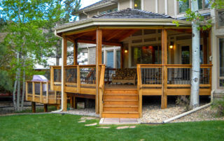 Constructed by DeckTec, this covered deck project offers a variety of vantage points for enjoying the surrounding scenery. A custom designed roof cover allows for ample protected space for entertaining, lounging and dining while being protected from the elements. Stairs lead downward to the home’s back yard creating easy access to different areas of the property. Designed to elevate the outdoor living experience, this covered deck design also features useful amenities that makes the area usable day or night.
